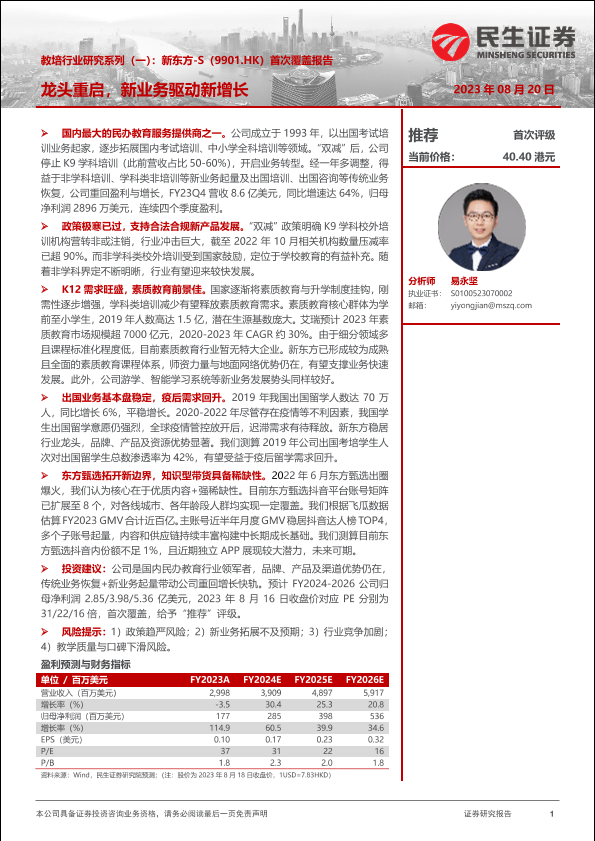 【民生证券】【20230820】教培行业研究系列(一):新东方-S(9901.HK)首次覆盖报告:龙头重启,新业务驱动新增长-41页