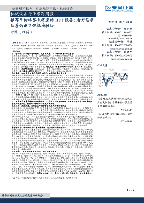【东吴证券】【20230820】机械设备行业跟踪周报:推荐平价临界点将至的HJT设备;看好需求改善的出口链机械板块-46页