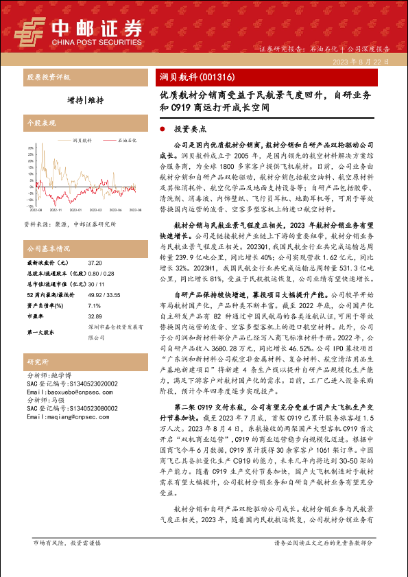 【中邮证券】【20230822】润贝航科(001316)优质航材分销商受益于民航景气度回升,自研业务和C919商运打开成长空间-23页