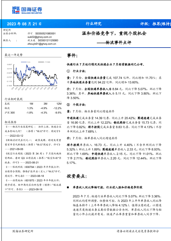 【国海证券】【20230821】物流行业事件点评:温和价格竞争下,重视个股机会-15页