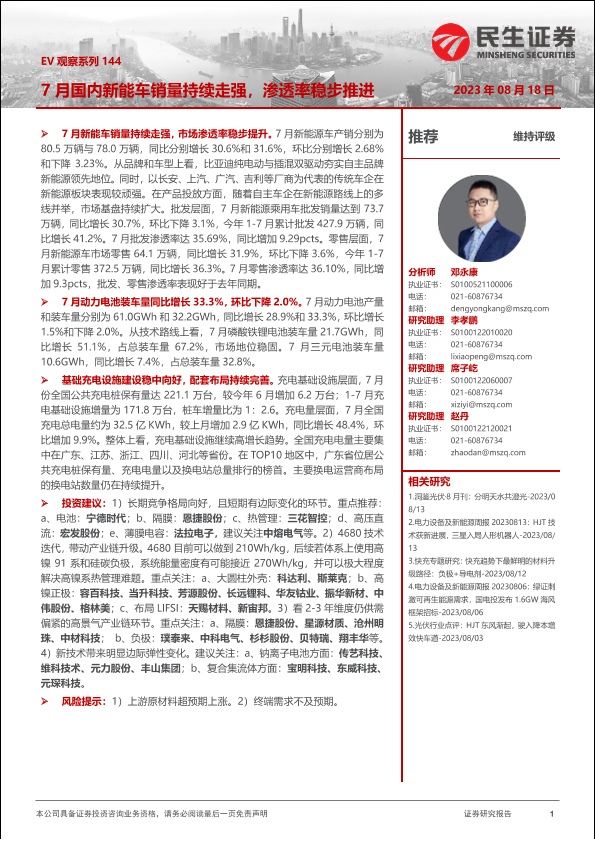 【民生证券】【20230818】电力设备及新能源:EV观察系列144-7月国内新能车销量持续走强,渗透率稳步推进-20页