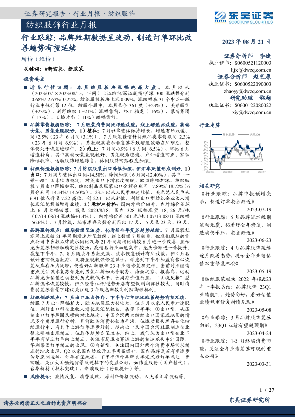 【东吴证券】【20230821】纺织服饰行业月报:行业跟踪:品牌短期数据呈波动,制造订单环比改善趋势有望延续-27页
