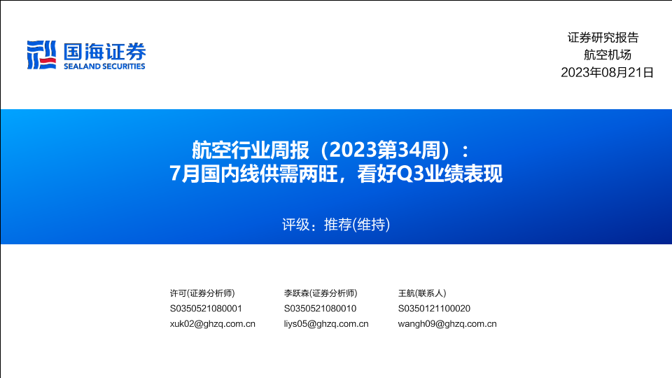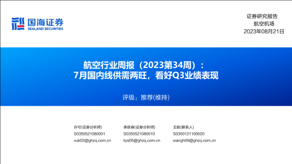 【国海证券】【20230821】航空行业周报(2023第34周):7月国内线供需两旺,看好Q3业绩表现-32页
