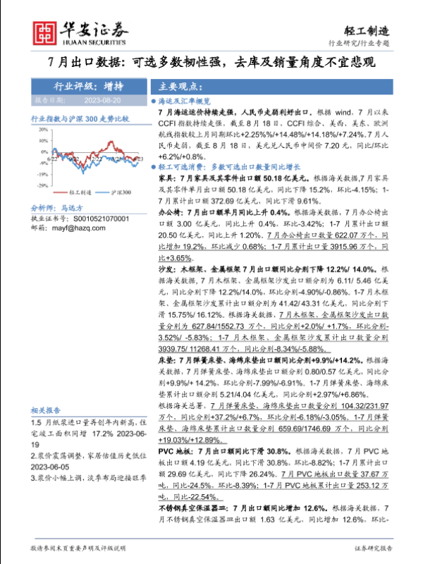 【华安证券】【20230820】轻工制造行业专题:7月出口数据:可选多数韧性强,去库及销量角度不宜悲观-25页