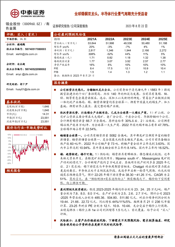 【中泰证券】【20230822】锡业股份(000960)全球锡铟双龙头,半导体行业景气周期充分受益者-31页