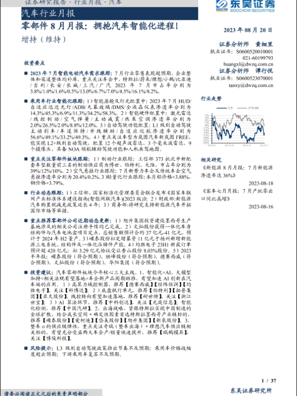 【东吴证券】【20230820】零部件8月月报:拥抱汽车智能化进程!-37页