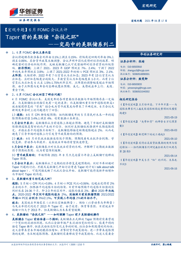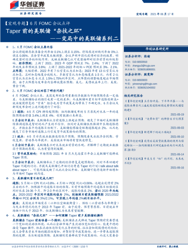 【华创证券】【20210617】6月FOMC会议点评:变局中的美联储系列二,Taper前的美联储“杂技之环”-21页