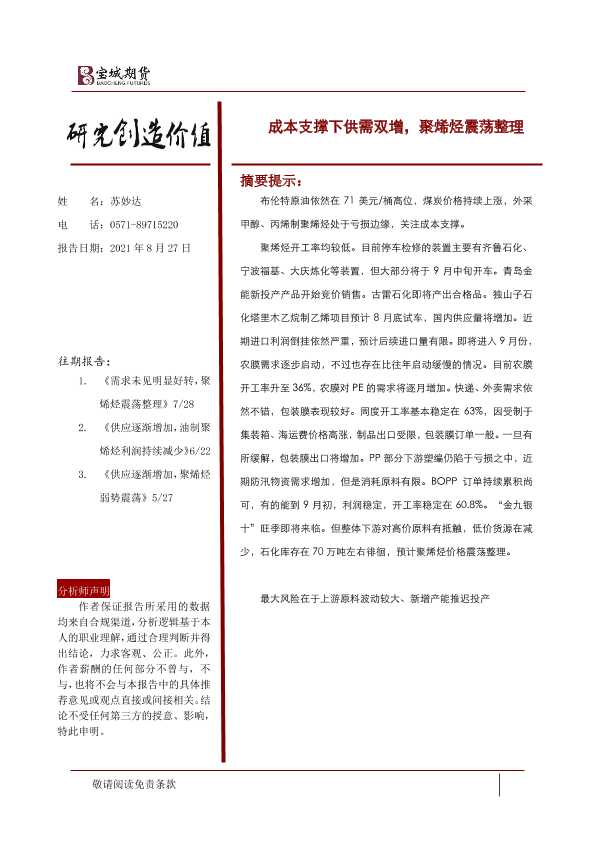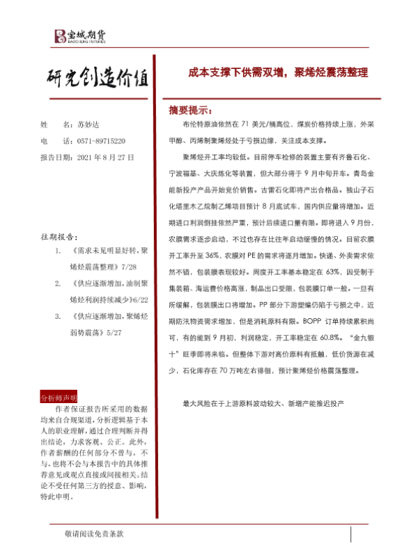 【宝城期货】【20210827】成本支撑下供需双增,聚烯烃震荡整理-20页