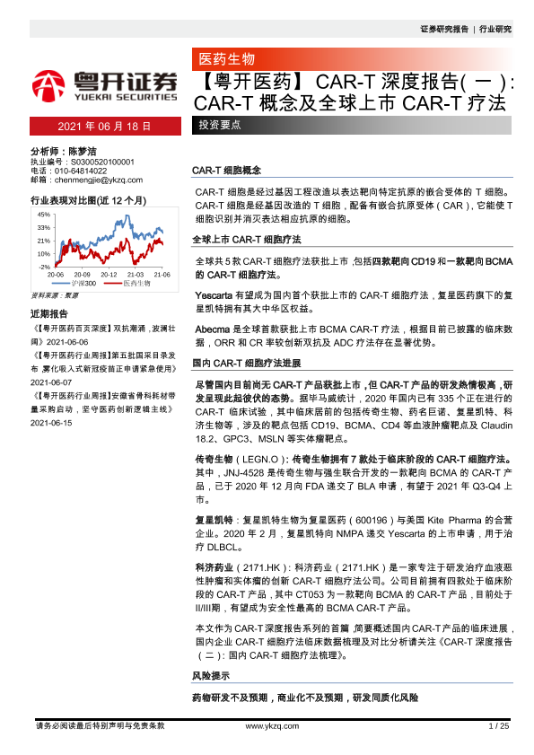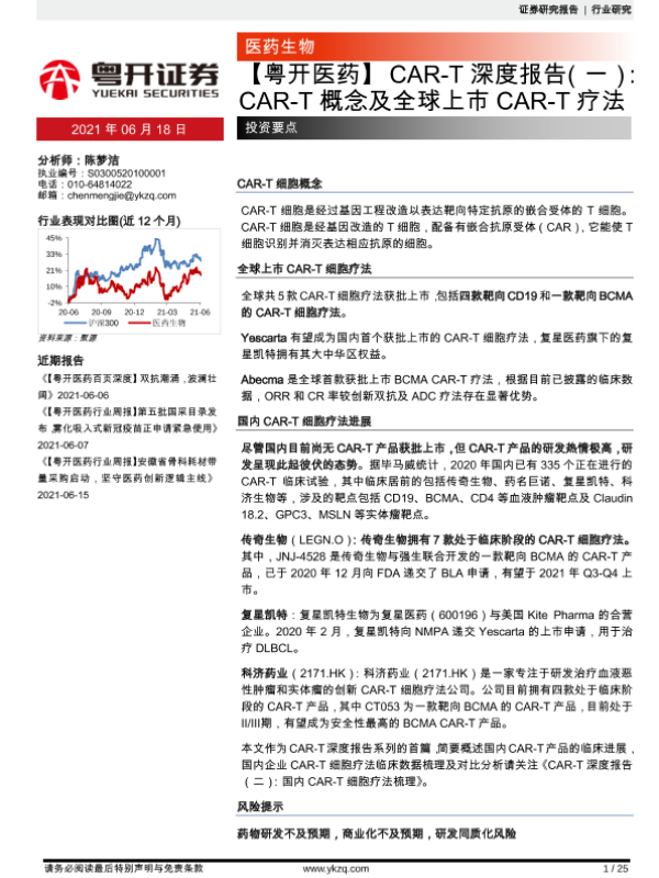 【粤开证券】【20210618】【粤开医药】CAR-T深度报告(一):CAR-T概念及全球上市CAR-T疗法-25页