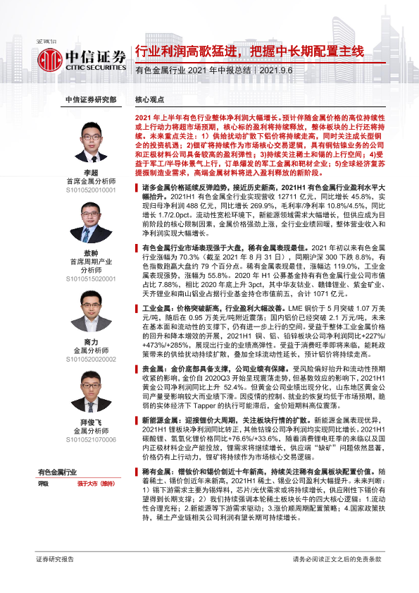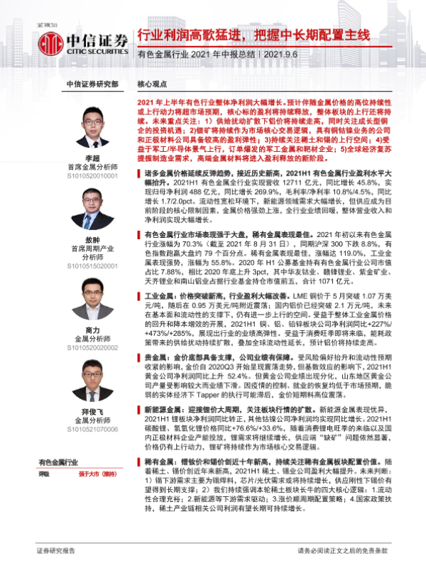 【中信证券】【20210906】有色金属行业2021年中报总结:行业利润高歌猛进,把握中长期配置主线-30页