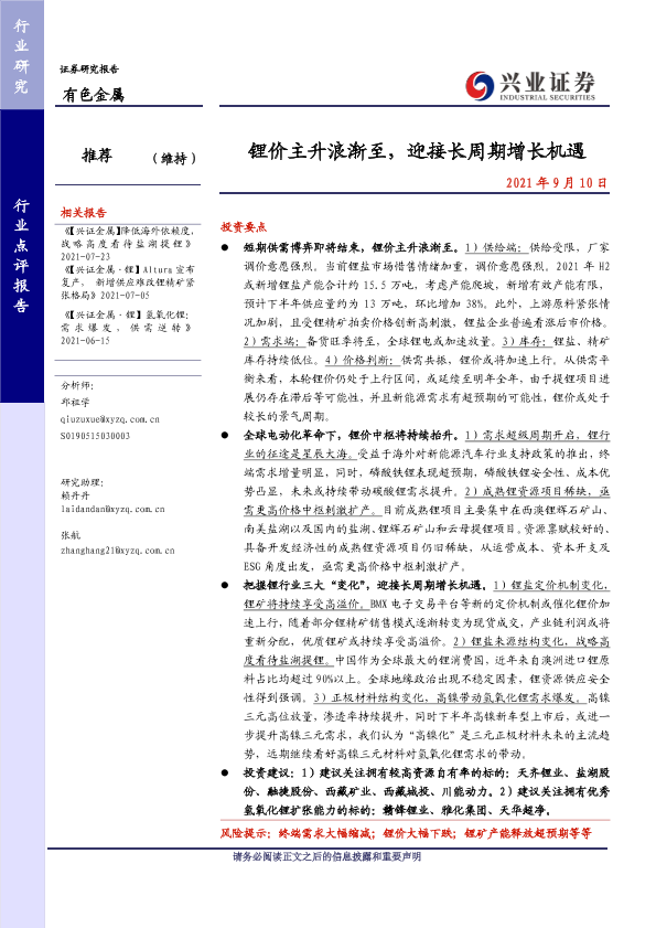【兴业证券】【20210910】有色金属行业:锂价主升浪渐至,迎接长周期增长机遇-27页