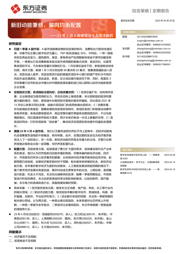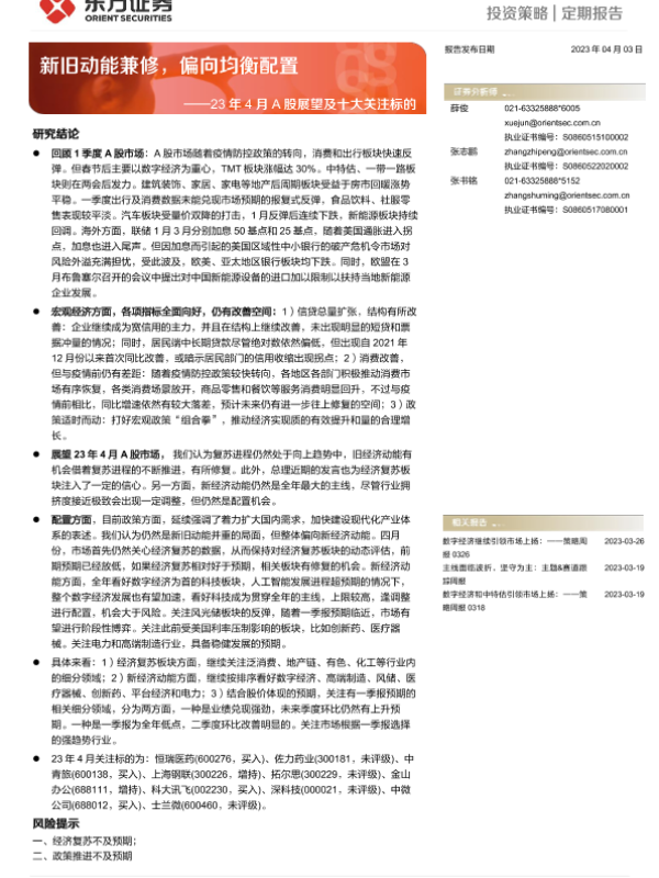 【东方证券】【20230403】23年4月A股展望及十大关注标的:新旧动能兼修,偏向均衡配置-16页