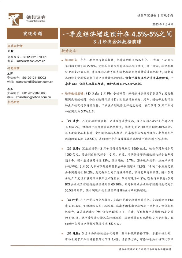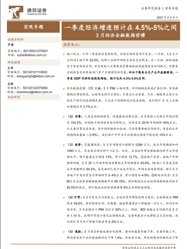 【德邦证券】【20230404】3月经济金融数据前瞻:一季度经济增速预计在4.5%-5%之间-15页