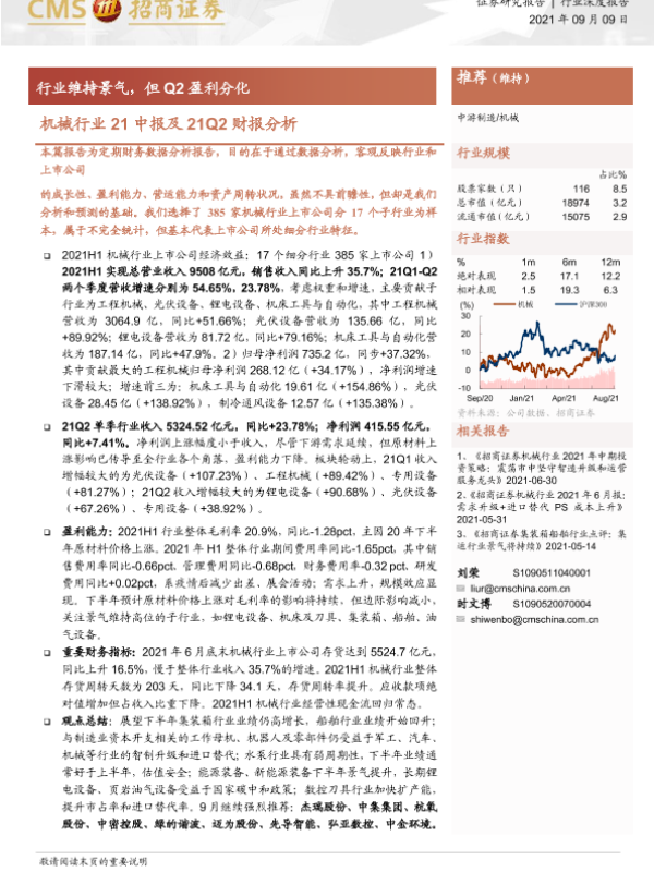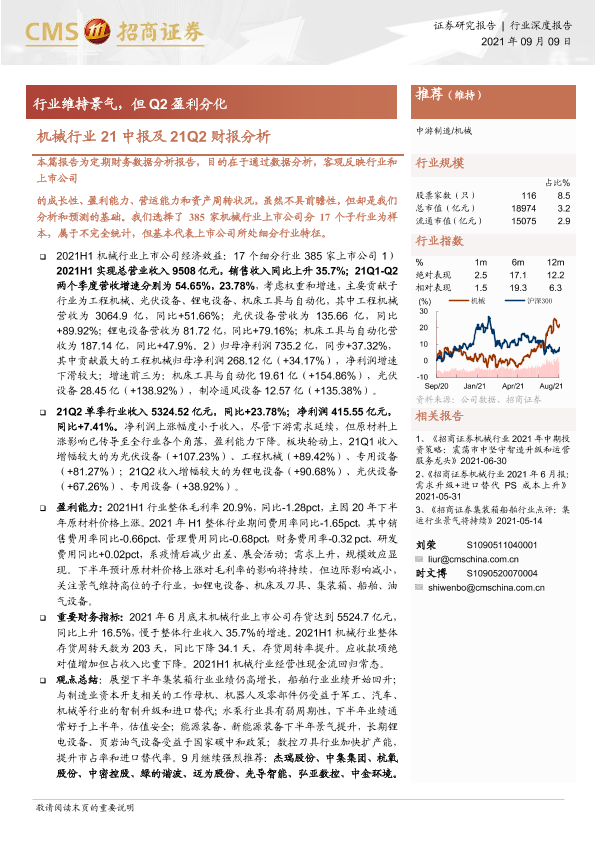 【海通证券】【20210909】机械行业21中报及21Q2财报分析:行业维持景气,但Q2盈利分化-16页