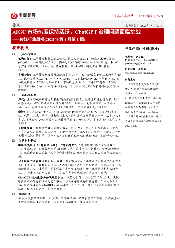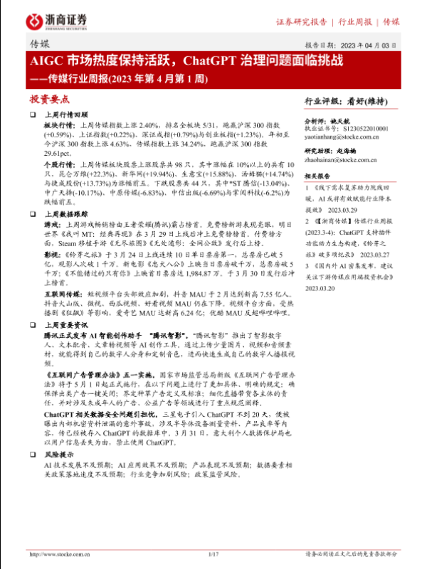 【浙商证券】【20230403】传媒行业周报:AIGC市场热度保持活跃,ChatGPT治理问题面临挑战-17页