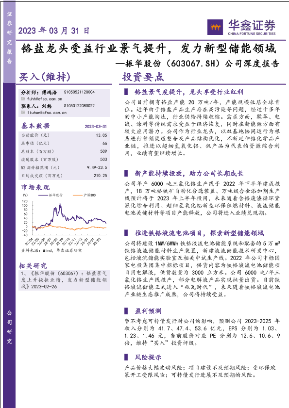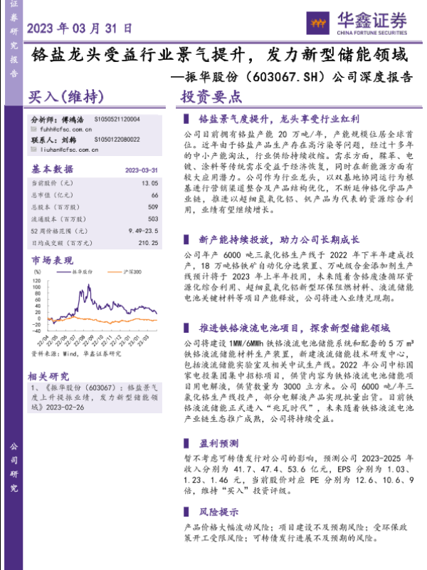 【华鑫证券】【20230331】公司深度报告:铬盐龙头受益行业景气提升,发力新型储能领域-30页