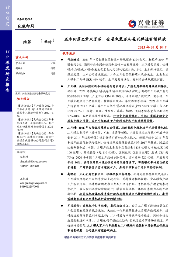 【兴业证券】【20230404】包装印刷行业深度研究:成本回落&需求复苏,金属包装龙头盈利弹性有望释放-32页
