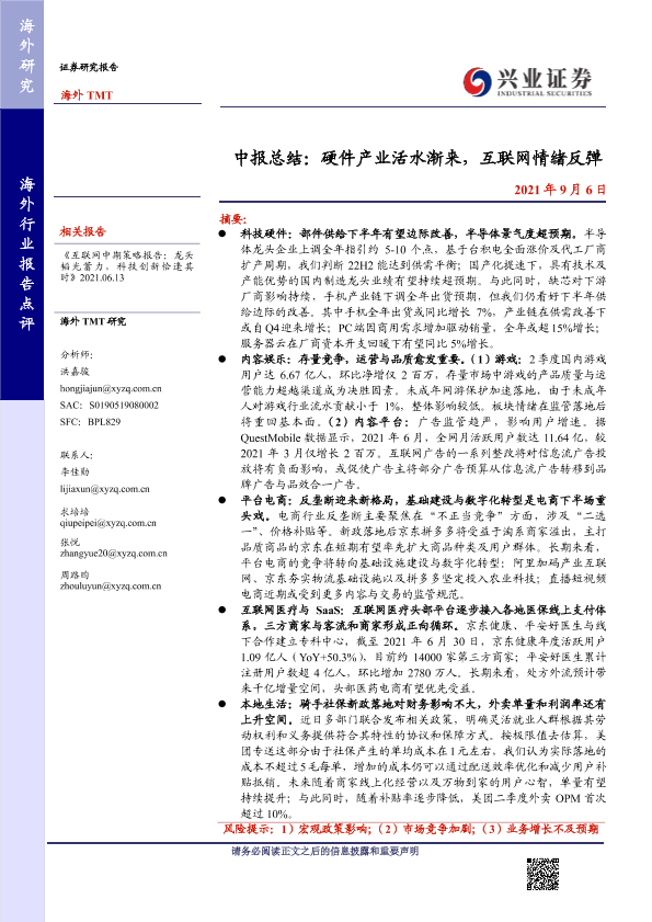 【兴业证券】【20210906】海外TMT行业中报总结:硬件产业活水渐来,互联网情绪反弹-46页
