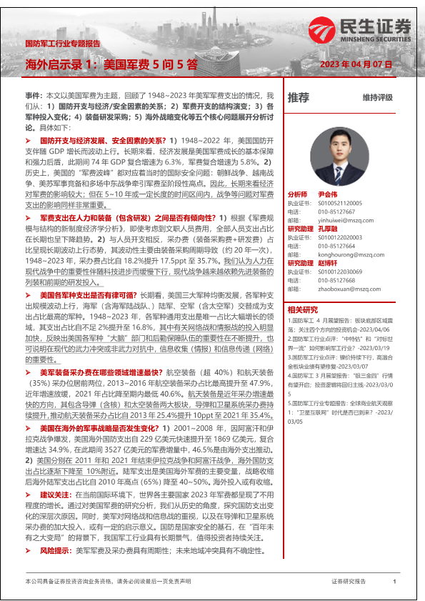 【民生证券】【20230407】国防军工行业专题报告:海外启示录1,美国军费5问5答-20页