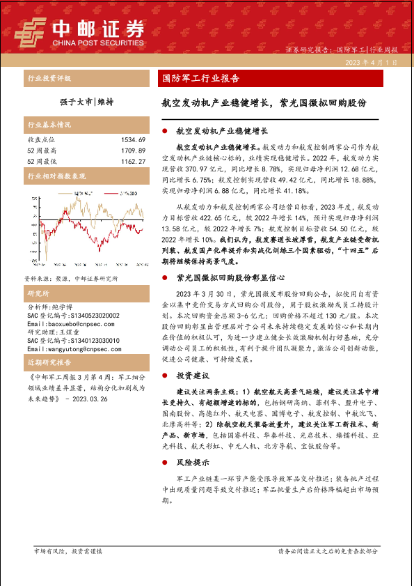 【中邮证券】【20230401】国防军工行业报告:航空发动机产业稳健增长,紫光国微拟回购股份-18页