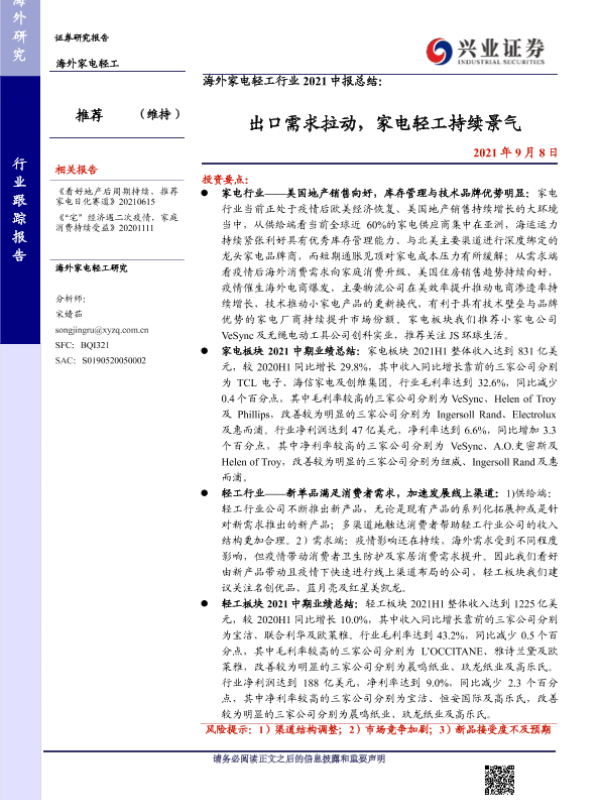 【兴业证券】【20210908】海外家电轻工行业2021中报总结:出口需求拉动,家电轻工持续景气-16页