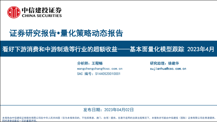 【中信建投证券】【20230402】基本面量化模型跟踪月报2023年4月:看好下游消费和中游制造等行业的超额收益-34页