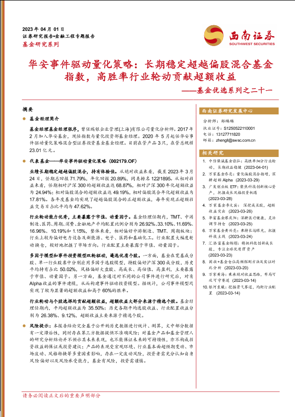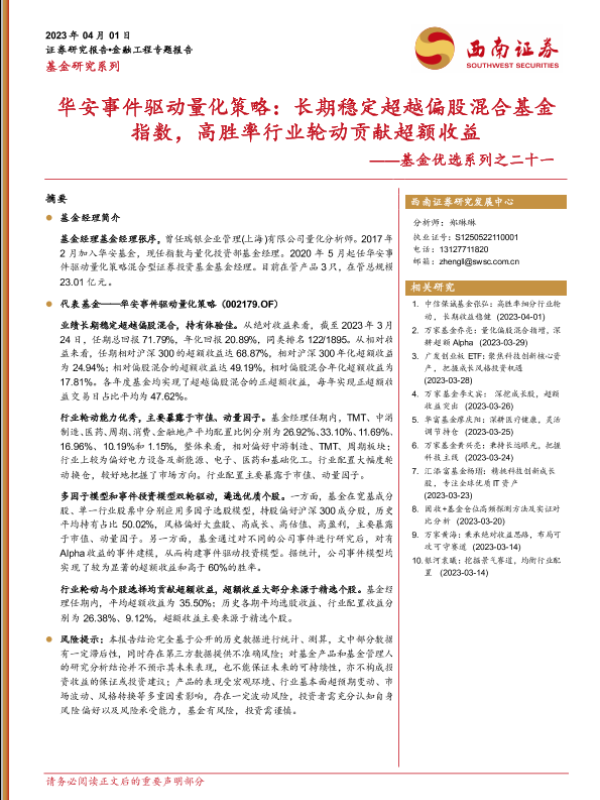 【西南证券】【20230401】基金优选系列之二十一:华安事件驱动量化策略,长期稳定超越偏股混合基金指数,高胜率行业轮动贡献超额收益-24页