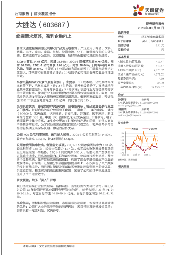 【天风证券】【20230331】大胜达(603687)终端需求复苏,盈利企稳向上-22页