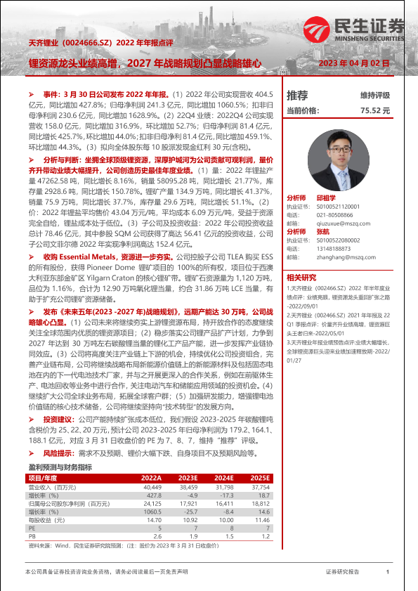【民生证券】【20230402】天齐锂业2022年年报点评:锂资源龙头业绩高增,2027年战略规划凸显战略雄心-20页