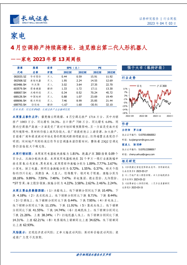 【长城证券】【20230403】家电2023年第13周周报:4月空调排产持续高增长,追觅推出第二代人形机器人-28页
