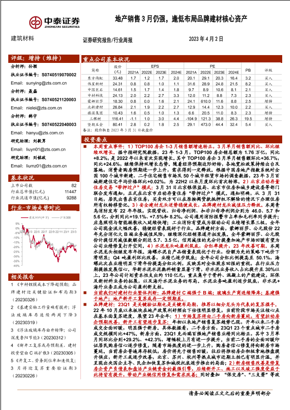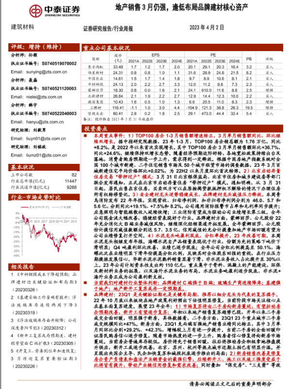 【中泰证券】【20230402】建筑材料行业周报:地产销售3月仍强,逢低布局品牌建材核心资产-24页