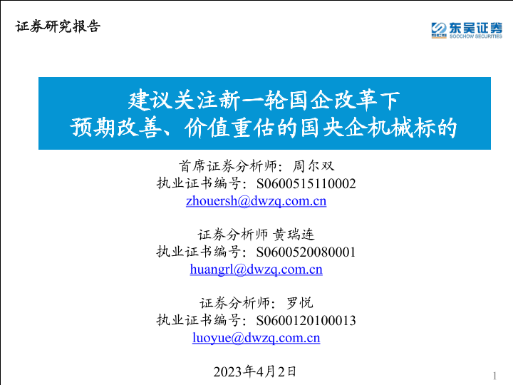 【东吴证券】【20230402】建议关注新一轮国企改革下预期改善、价值重估的国央企机械标的-90页