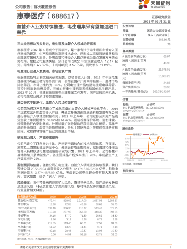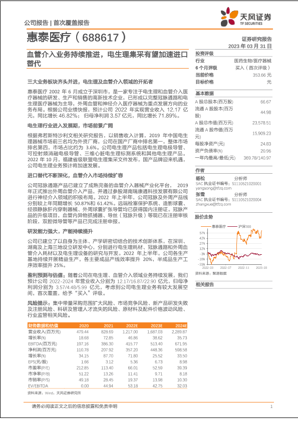 【天风证券】【20230331】惠泰医疗(688617)血管介入业务持续推进,电生理集采有望加速进口替代-34页