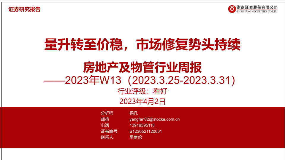 【浙商证券】【20230402】房地产及物管行业周报——2023年W13:量升转至价稳,市场修复势头持续-29页