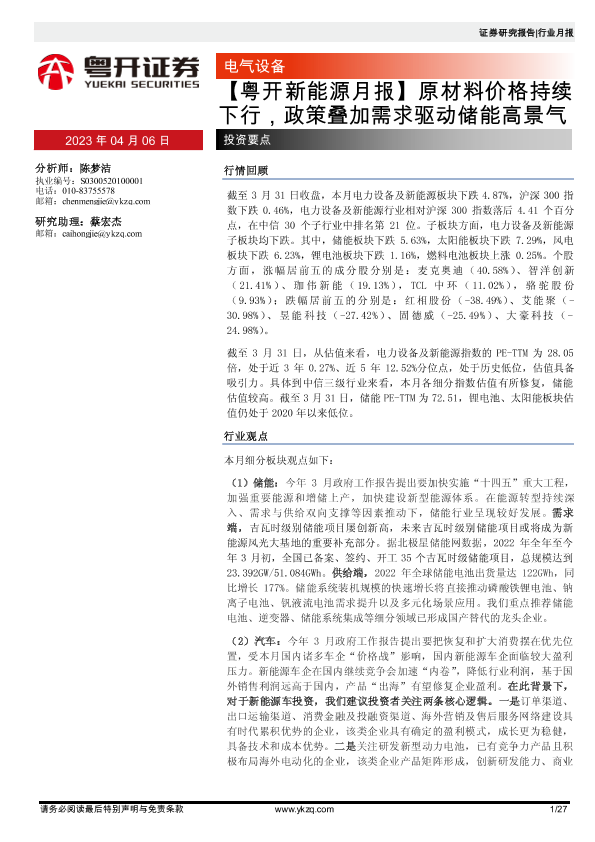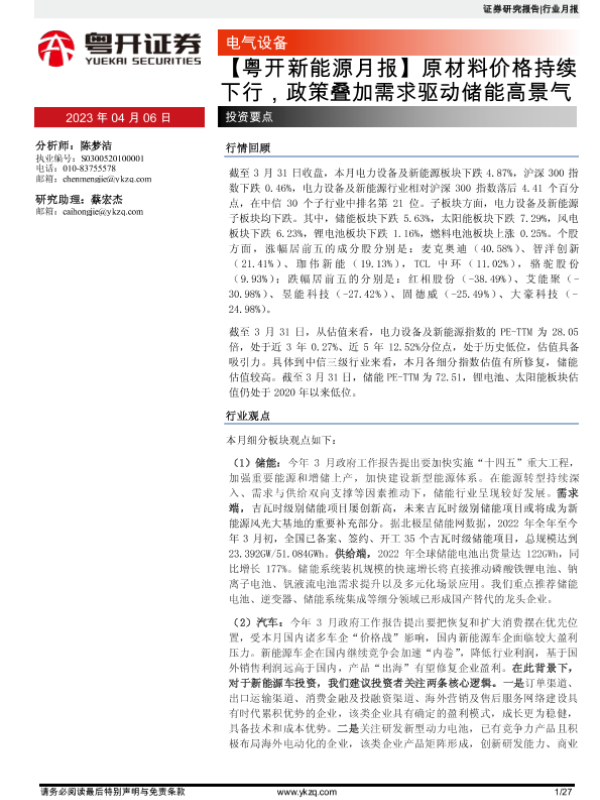 【粤开证券】【20230406】新能源月报:原材料价格持续下行,政策叠加需求驱动储能高景气-27页