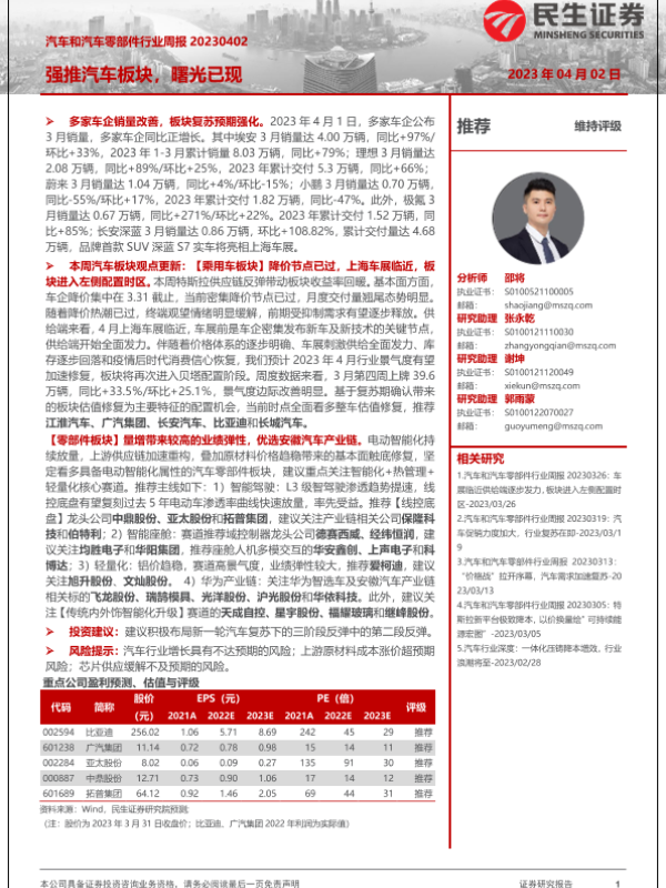 【民生证券】【20230402】汽车和汽车零部件行业周报:强推汽车板块,曙光已现-25页