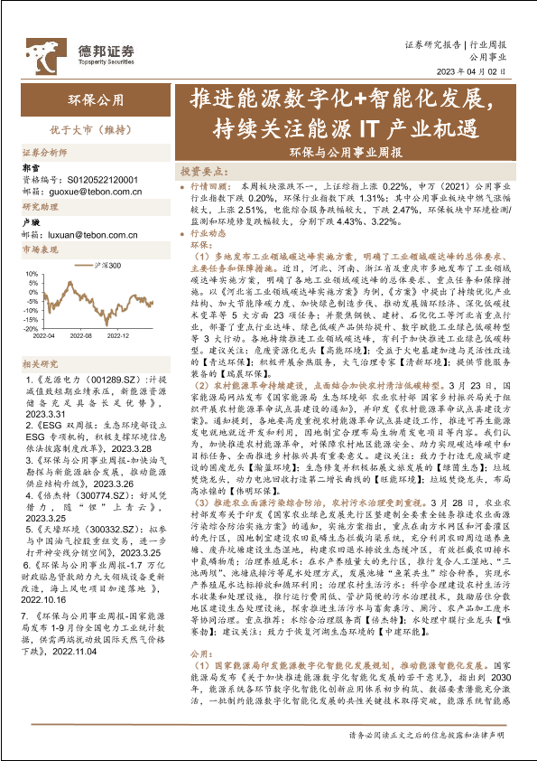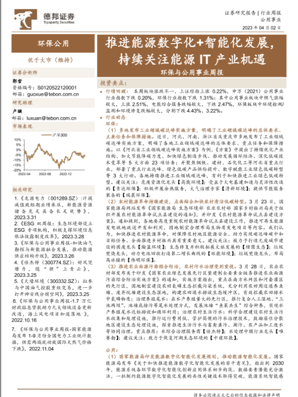 【德邦证券】【20230402】环保与公用事业行业周报:推进能源数字化+智能化发展,持续关注能源IT产业机遇-26页