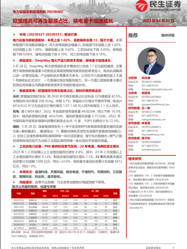 【民生证券】【20230402】电力设备及新能源行业周报:欧盟提高可再生能源占比,换电重卡加速成长-26页