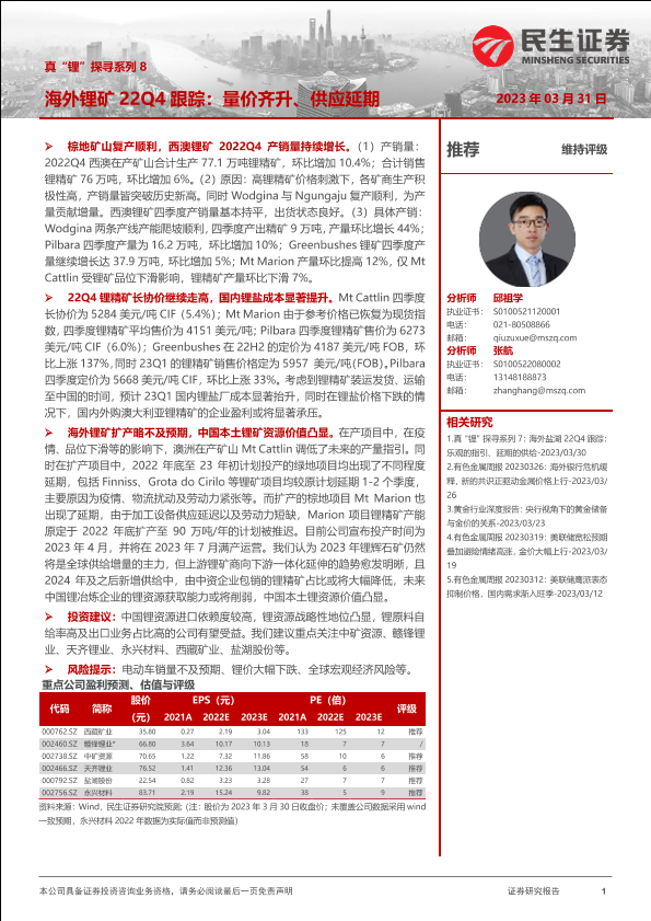 【民生证券】【20230331】真“锂”探寻系列8:海外锂矿22Q4跟踪:量价齐升、供应延期-27页
