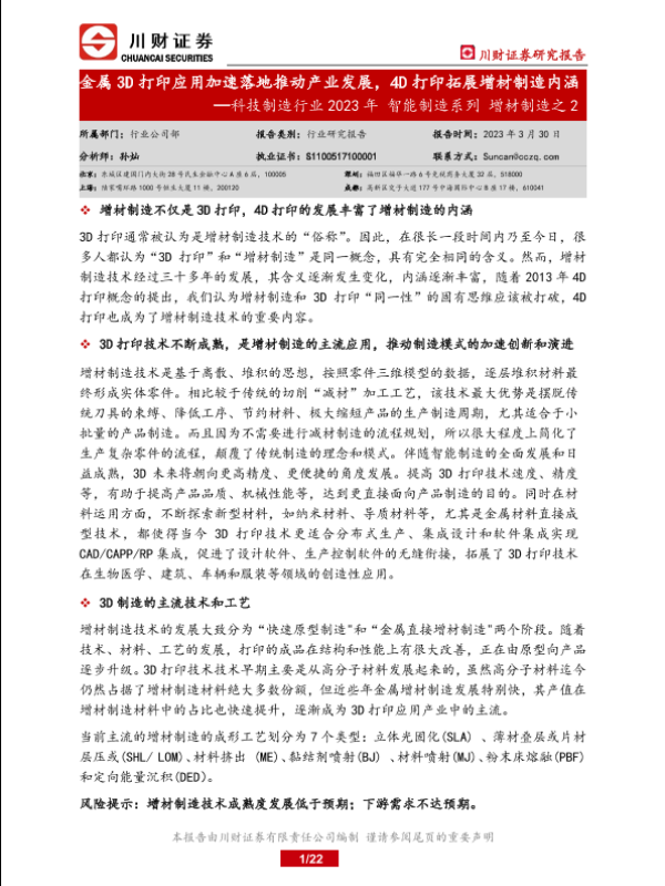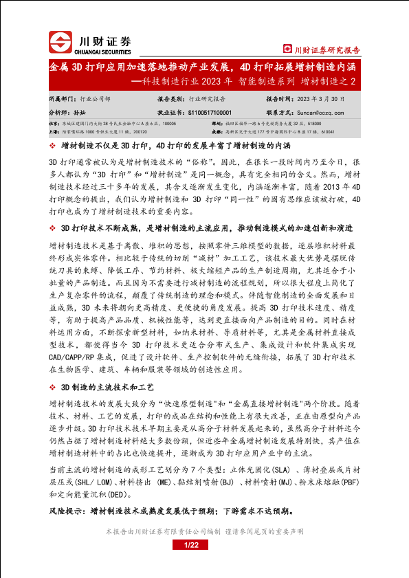 【川财证券】【20230330】科技制造行业2023年智能制造系列增材制造之2:金属3D打印应用加速落地推动产业发展,4D打印拓展增材制造内涵-22页