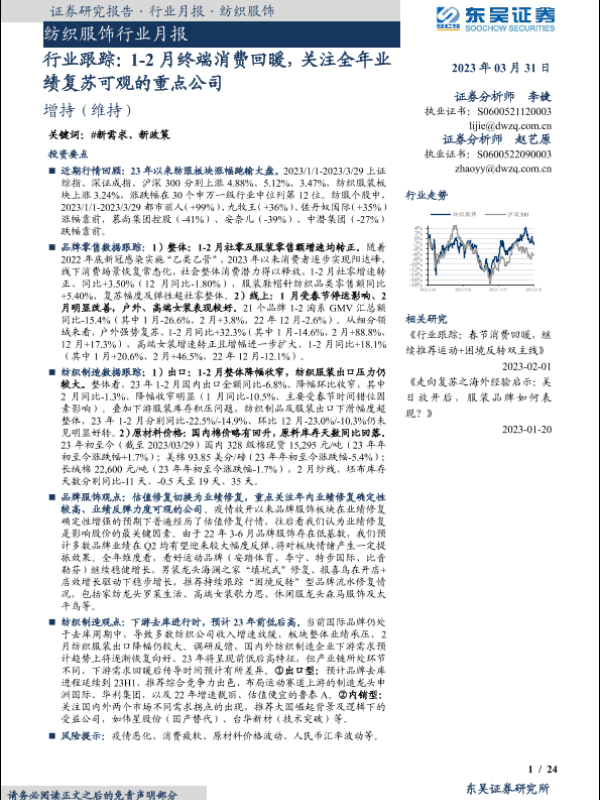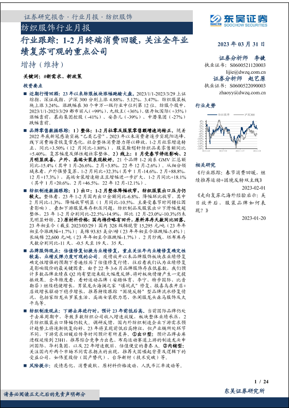 【东吴证券】【20230331】纺织服饰行业月报:行业跟踪:1-2月终端消费回暖,关注全年业绩复苏可观的重点公司-24页
