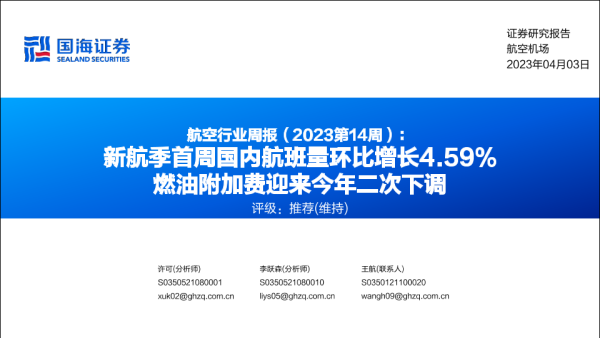 【国海证券】【20230403】航空行业周报(2023第14周):新航季首周国内航班量环比增长4.59% 燃油附加费迎来今年二次下调-22页