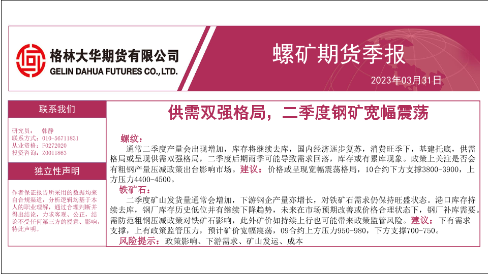 【格林大华期货】【20230331】螺矿期货季报:供需双强格局,二季度钢矿宽幅震荡-38页