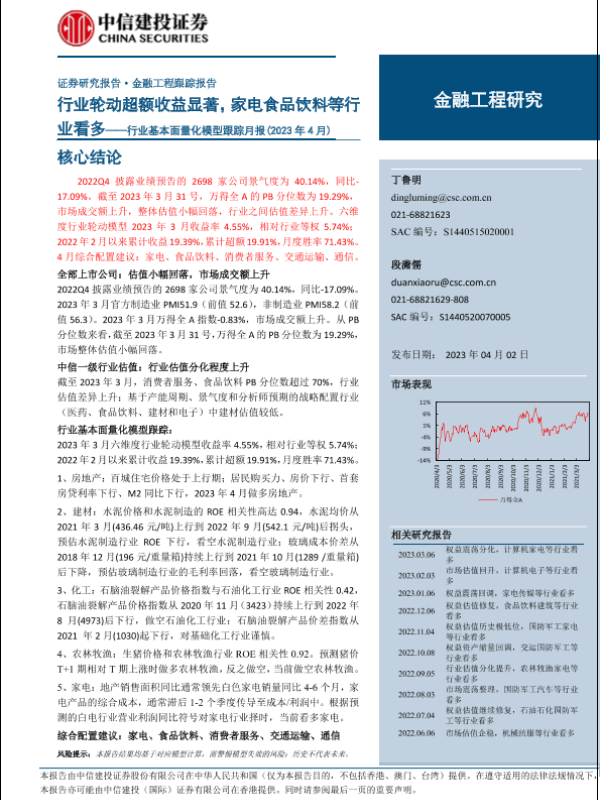 【中信建投证券】【20230402】行业基本面量化模型跟踪月报(2023年4月):行业轮动超额收益显著,家电食品饮料等行业看多-21页