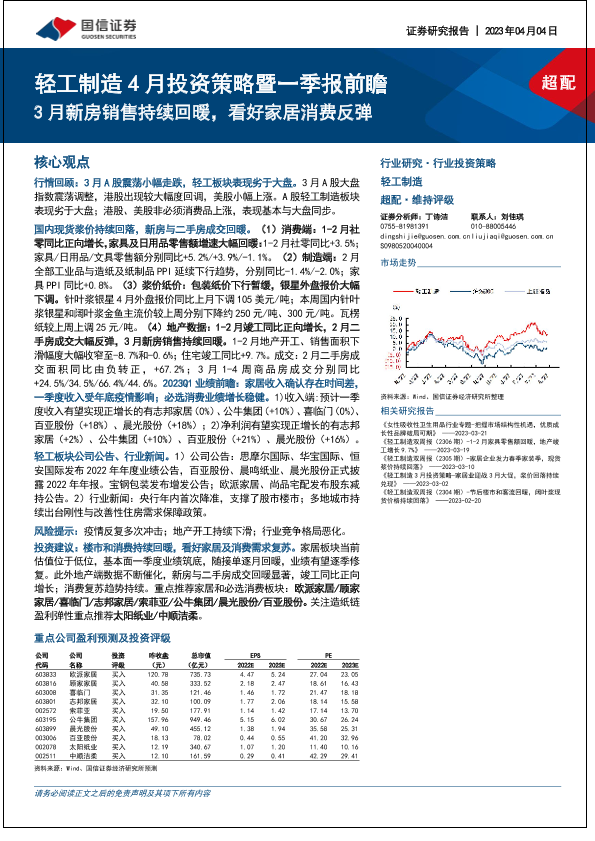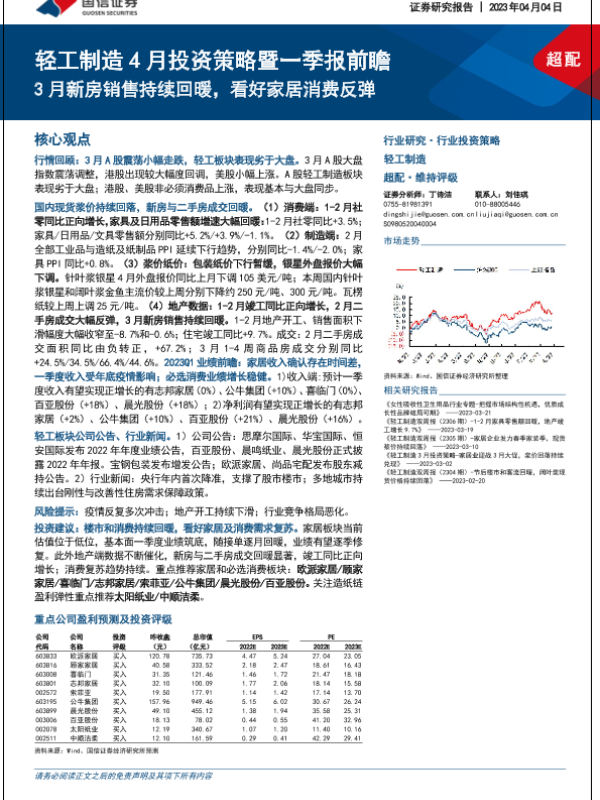 【国信证券】【20230404】轻工制造行业4月投资策略暨一季报前瞻:3月新房销售持续回暖,看好家居消费反弹-26页