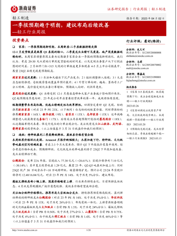 【浙商证券】【20230402】轻工行业周报:一季报预期趋于明朗,建议布局后续改善-28页