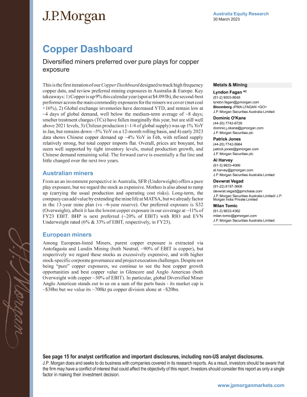 【J.P. Morgan】【20230330】JPMorgan-Copper Dashboard Diversified miners preferred over pure plays for copper exposure-19页