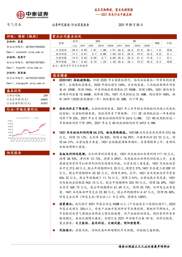 【中泰证券】【20210905】电气设备行业2021风电行业中报总结:成本风险释放,需求或超预期-23页