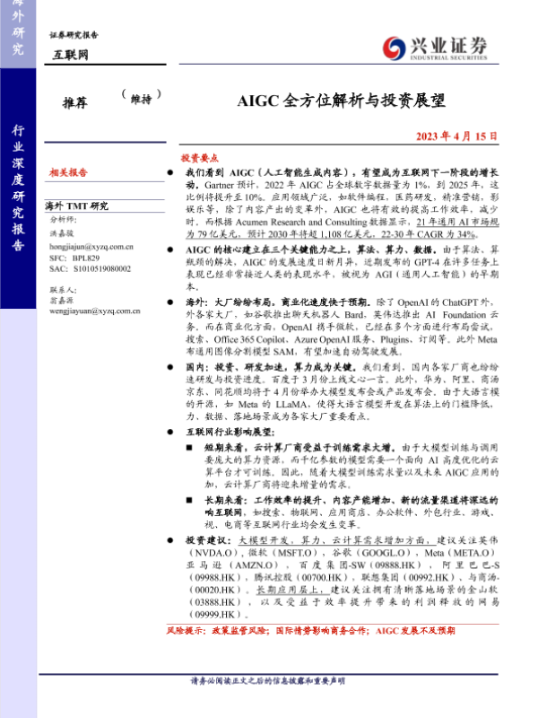 AIGC 互联网 人工智能生成内容 技术发展 投资展望