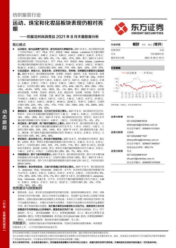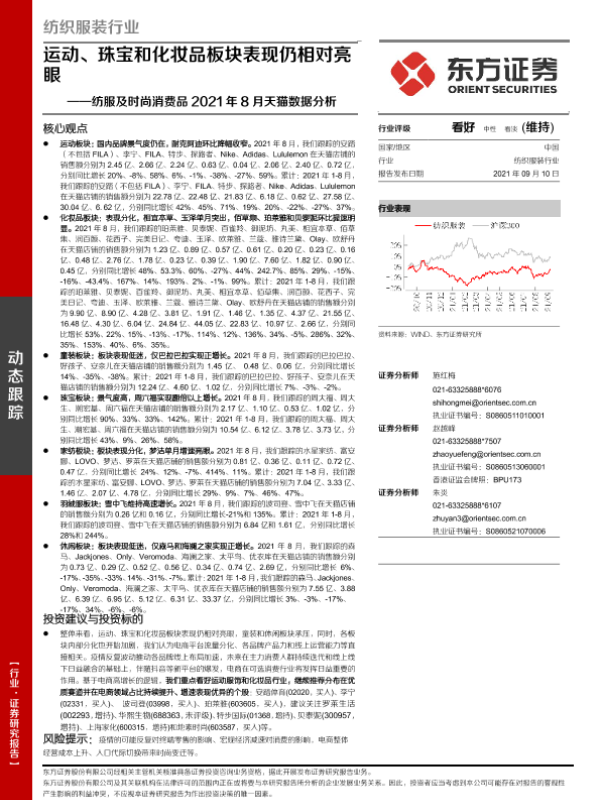 【东方证券】【20210910】纺织服装行业:纺服及时尚消费品2021年8月天猫数据分析,运动、珠宝和化妆品板块表现仍相对亮眼-16页
